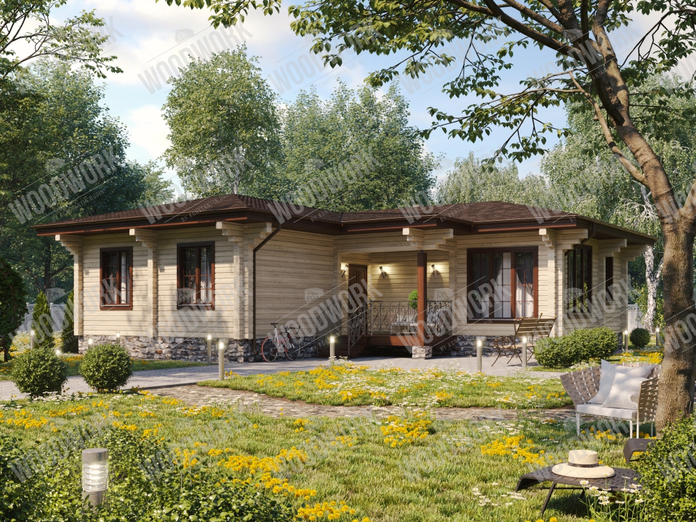 Коттедж в один этаж с тремя спальнями, объединенной зоной гостиной и кухни, раздельным санузлом, выделенными помещениями под гардероб, котельную, кладовую.